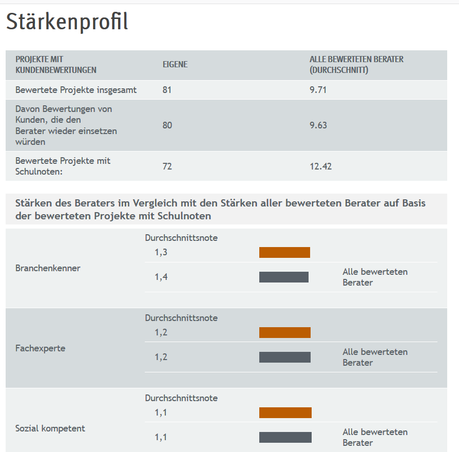 81 bewertete Beratungsprojekte von Daria Freitag gaben Kunden, die einen Berater gesucht haben einen Überblick über die Kundenmeinungen zu von ihr durchgeführten Beratungen. Hier ein paar screenshots vom Dezember 2019.